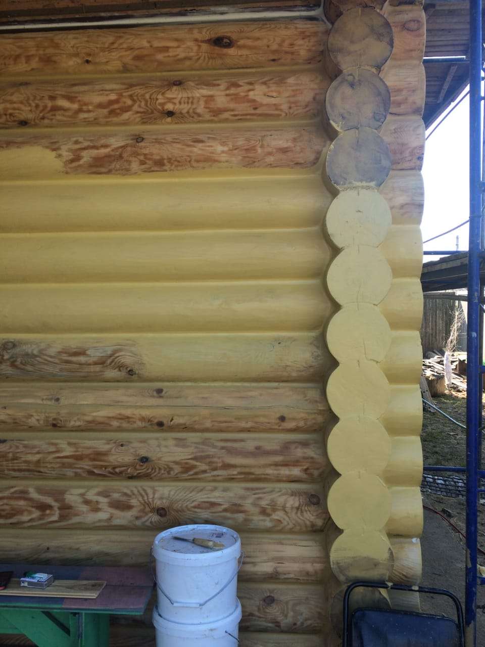 Первичное шлифование сруба крупнозернистыми насадками. В процессе работ дерево покрывается «ворсом», убирается синева, поражённые плесенью и грибком участки, если таковые имеются.